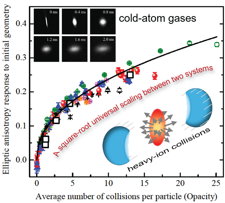 该研究发现了适用于冷原子气体与夸克-胶子等离子体由于初始空间各向异性而产生的动量空间各向异性膨胀的普适标度律,以及它们类似于“随机游走”的典型特征。该研究成果有效挑战了描述相互作用系统膨胀机制的流体动力学范式,促进我们对各向异性膨胀机制的更深入理解。该研究在冷原子气体与夸克-胶子等离子体——这两个体系在尺度、温度和物理原理上都存在巨大区别,看似完全不相干的系统——间搭建了桥梁。人们普遍认为夸克-胶子等离子体是我们宇宙的最初始状态,但相关实验研究存在不可避免的局限性;而基于常规实验室条件的冷原子系统具有参数空间可以大范围准确调节的优势。因此,该研究成果检验了基于冷原子实验系统研究夸克-胶子等离子体的优越性,进而有可能推进我们对早期宇宙的进一步研究。